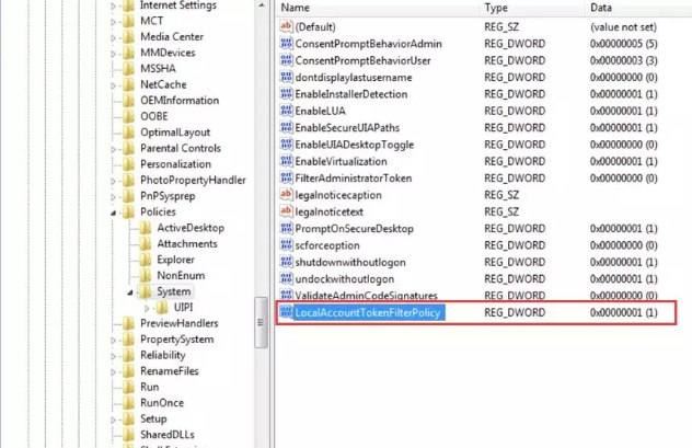 同時,修改LocalAccountTokenFilterPolicy 鍵,登錄檔路徑為:HKLM\SOFTWARE\Microsoft\Windows\CurrentVersion\Policies\System\LocalAccountTokenFilterPolicy,即禁用UAC遠端限制,從而避免電腦被遠端操作時觸發UAC。