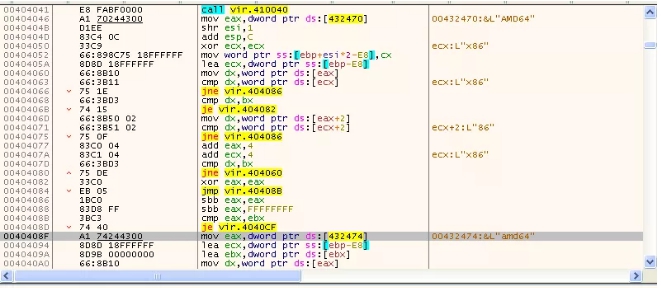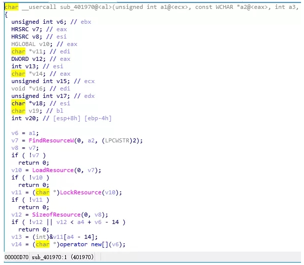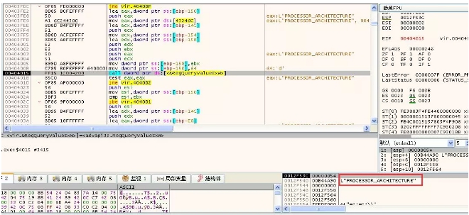 2. 該程式在記憶體中會先解密出大量的字串,通過運行時獲取函數位址以及解密關鍵的字串都是有效躲避安全軟體查殺的方法。0x4043F0 就是解密字串函數。